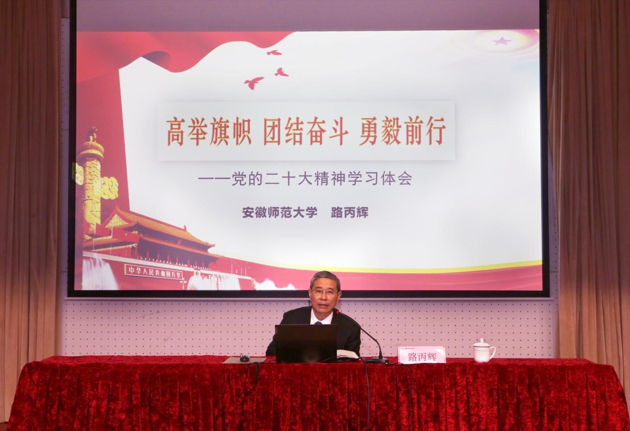 11月28日下午,学校举行党的二十大精神宣讲报告会,特邀党的二十大代表、省委宣讲团成员、安徽师范大学马克思主义学院路丙辉教授作专题宣讲报告。各二级党组织负责人,全体专职思政课教师、专职辅导员和班级思政委员代表参加报告会。报告会由党委副书记王俊和主持。