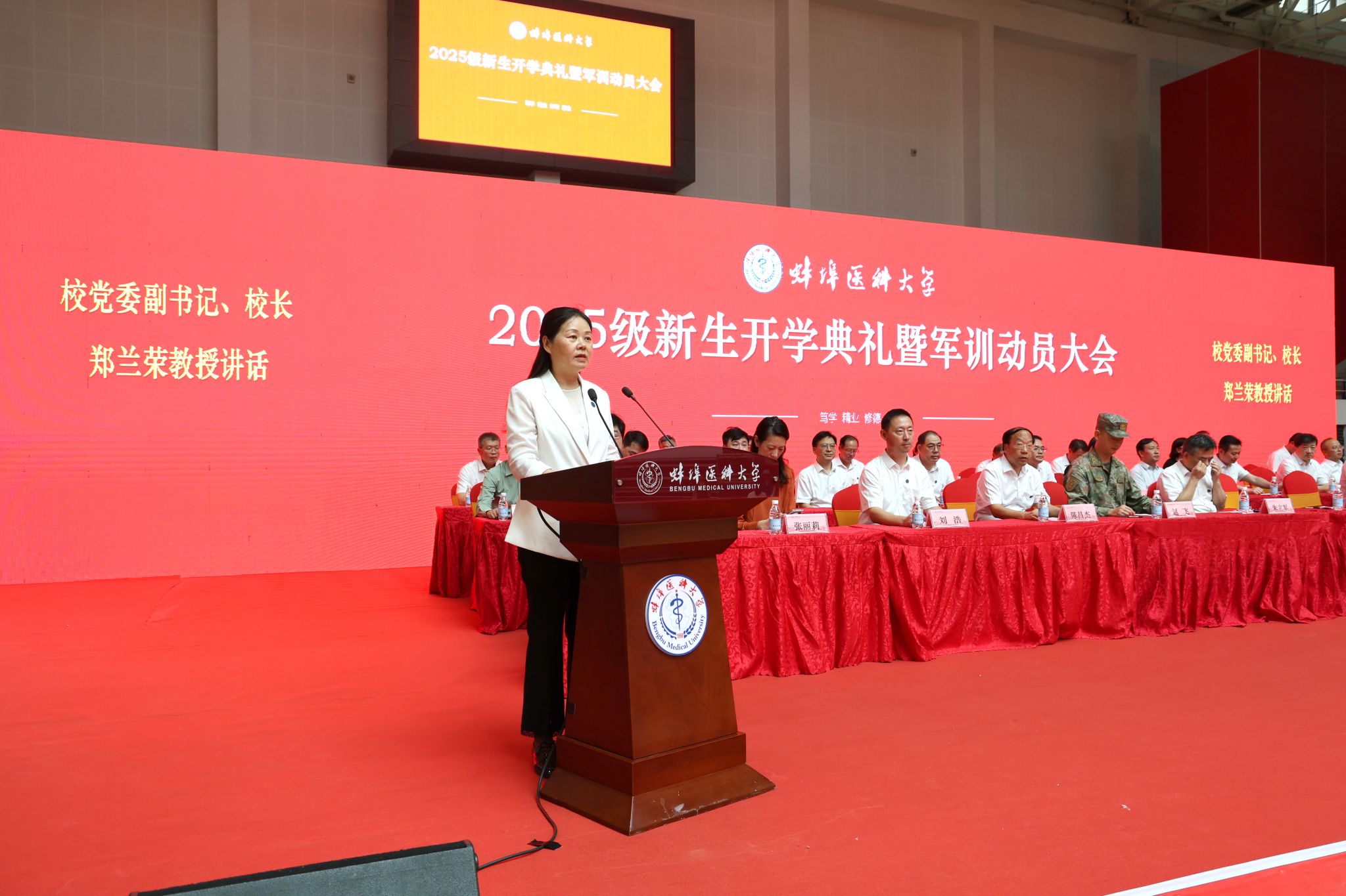 开学典礼在庄严的国歌声中拉开帷幕。郑兰荣的讲话以《以仁心为灯,照立命之路;以勤学为帆,航立行之舟》为题,通过“以敬畏生命、肩负使命而立命、以精进不休、勇于探索而立学、以仁心仁术、大医精诚而立心、以时代召唤、投身实践而立行”四个方面与新生交流了如何走好未来的大学之路、医学之路、人生之路。她说,67年来,一代代蚌医人胸怀报国的赤诚情怀,承担着振兴祖国医疗卫生事业,提高人民群众健康水平的崇高使命,一代代蚌医人扎根江淮、服务基层、救死扶伤、贡献社会。郑兰荣寄语同学们秉承“笃学、精业、修德、厚生”的蚌医校训,在广阔的医学汪洋中找到属于自己的那座璀璨航标,立志为推动医学科技进步,守护人民生命健康贡献智慧。在实现中华民族伟大复兴的中国梦的征程中,写下属于新时代青年的璀璨华章!