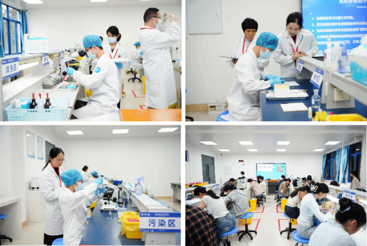 本次大赛分为专业操作技能竞赛和专业知识竞赛两个环节。专业操作技能竞赛包括ABO血型鉴定、ELISA测定HBsAg、平板分区划线分离及细菌的革兰染色镜检共3个项目,考察参赛选手的操作规范性、精准性和生物安全意识;专业知识竞赛涵盖了临检、血液、生化、免疫、微生物、分子等基本知识的综合应用和形态学的分析判断,考察选手对专业知识掌握的深度和广度。经专业操作技能竞赛和专业知识竞赛总成绩排布,在29所院校中遴选6支队伍进行了“特等奖争霸赛”。
