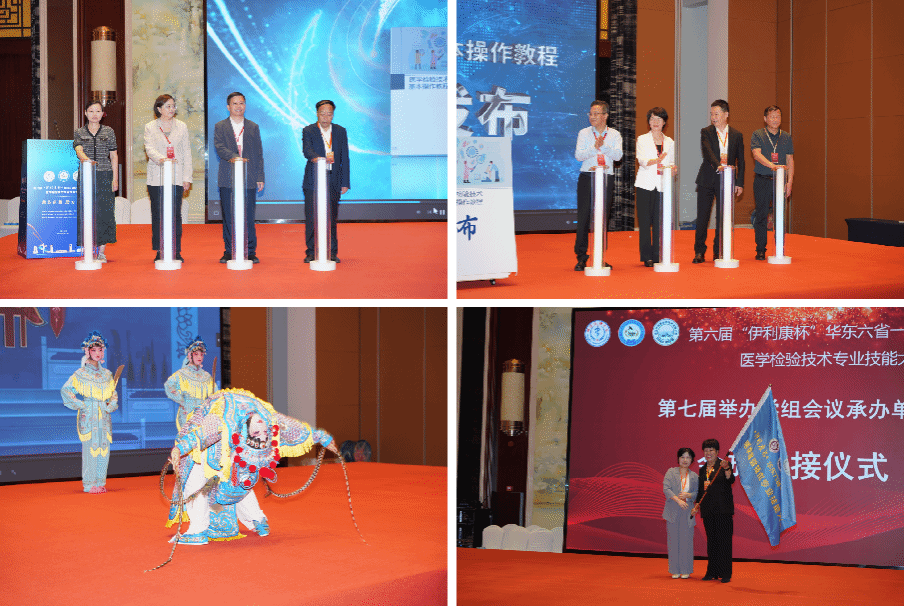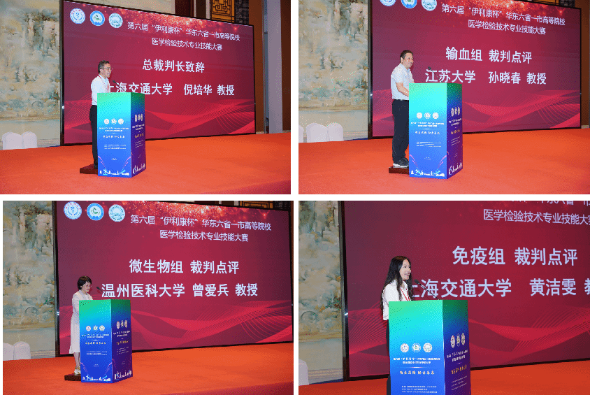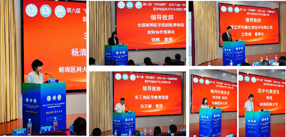 陈昌杰教授致欢迎词,他表示,本届医学检验技术专业技能大赛是一次对华东六省一市高校医学检验专业教学成果的集中检阅,更是检验学子展示技能、交流互鉴的重要平台。希望全体参赛选手能够以饱满的热情、严谨的态度投入比赛,在竞技中提升技能,在交流中共同进步,充分展现新时代医学检验学子的专业素养与青春风采。全国高等院校医学检验专业校际协作理事会副理事长、江苏大学钱晖教授,长三角医学教育联盟关万春教授,浙江伊利康生物技术有限公司王贤理董事长分别致辞。安徽医科大学张侠家教授代表裁判发言,蚌埠医科大学参赛选手高悦代表选手发言。