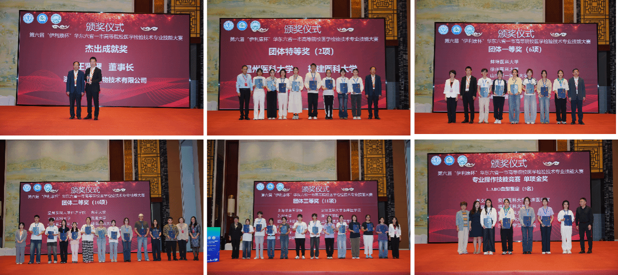 本次大赛也评选出17名单项操作金奖和20名专业知识竞赛金奖以及杰出成就奖。经过两天的激烈角逐,我校学子荣获第六届“伊利康华杯”华东六省一市高等院校医学检验技术专业技能大赛团体一等奖第一名,并获5个单项金奖。其中姚婷婷获ABO血型鉴定金奖,谭景飒获平板分离划线及细菌革兰染色镜检金奖,高悦、姚婷婷和钱袁媛还分别获得专业知识竞赛金奖。
