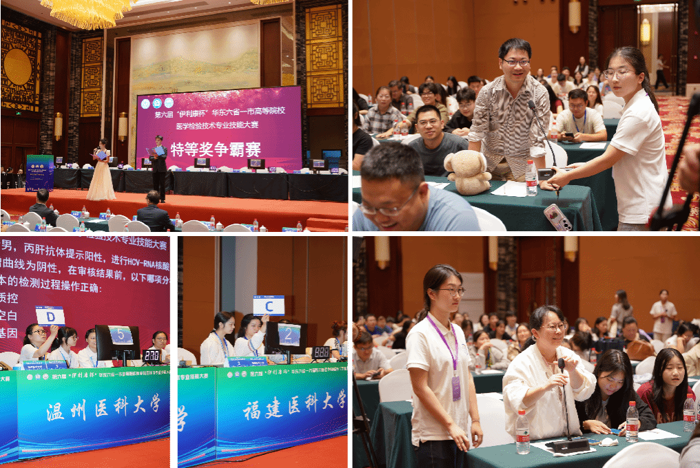 27号上午,“特等奖争霸赛”在龙子湖迎宾馆举行,围绕医学检验技术相关知识设置了必答题、抢答题、抽选题和附加题几种题型,考察选手的专业知识积累程度、应变能力和团队合作能力。会场气氛紧张、竞争激烈;现场还与师生围绕蚌埠特色进行了互动交流,气氛热烈。经过激烈角逐,温州医科大学、福建医科大学荣获本届大赛团体特等奖。