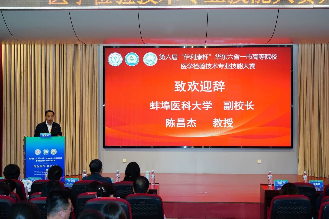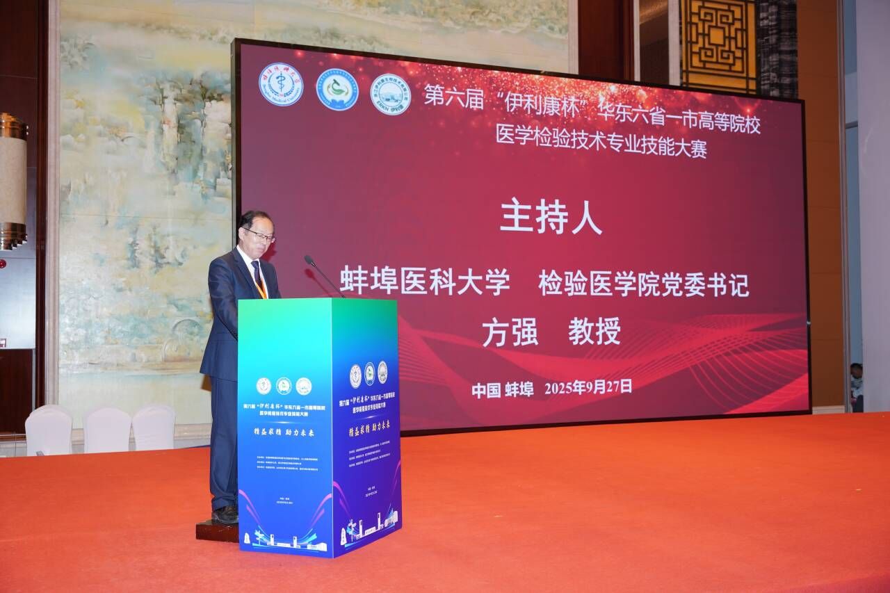 9月26日至27日,由全国高等院校医学检验专业校际协作理事会、长三角医学教育联盟主办,蚌埠医科大学、浙江伊利康生物技术有限公司承办,检验医学网、山东泽众电子科技有限公司、重庆华教科技有限公司协办的第六届“伊利康杯”华东六省一市高等院校医学检验技术专业技能大赛在我校成功举办。来自华东六省一市29所高等院校112名参赛选手和100多名老师及专家参会,校党委副书记、校长郑兰荣参与交流,校党委常委、副校长陈昌杰教授致欢迎词。本次大赛旨在促进华东六省一市高等院校师生之间的学习与交流,强化学生基本技能,深化教育教学改革,助力医学检验教育高质量发展。