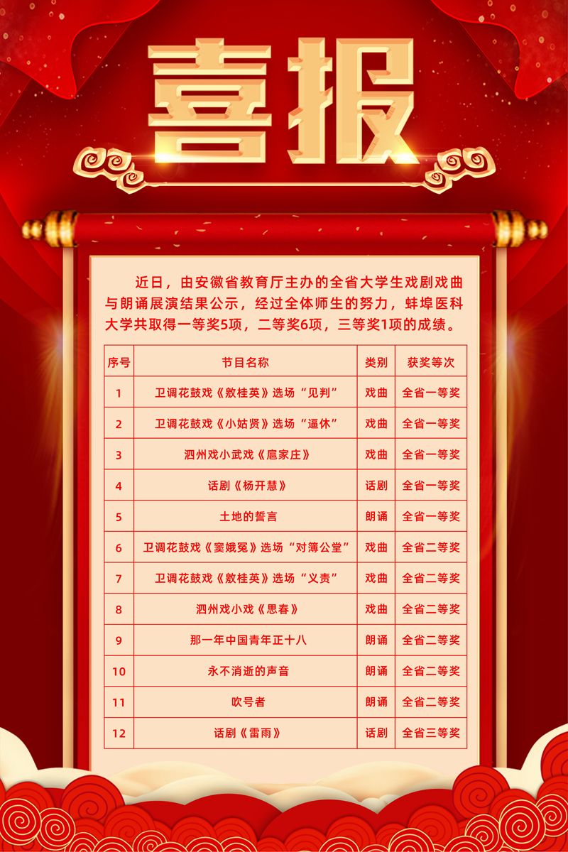 近日,由安徽省教育厅主办的全省大学生戏剧(戏曲)与朗诵专项展演评选结果揭晓,由我校报送的作品荣获5个省级一等奖,6个省级二等奖,1个省级三等奖,充分彰显了学校思政教育和文化育人的丰硕成果。