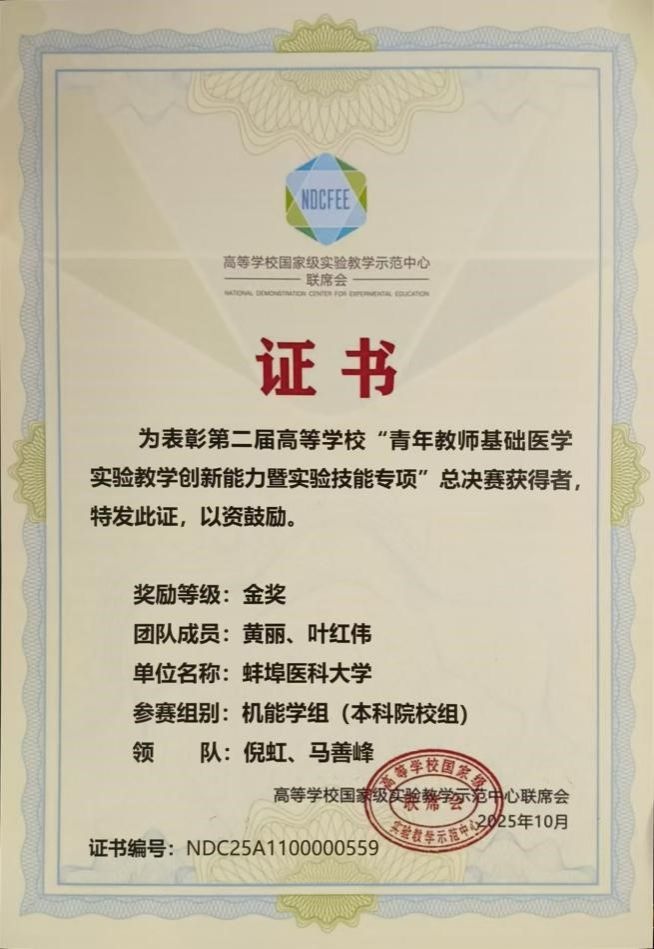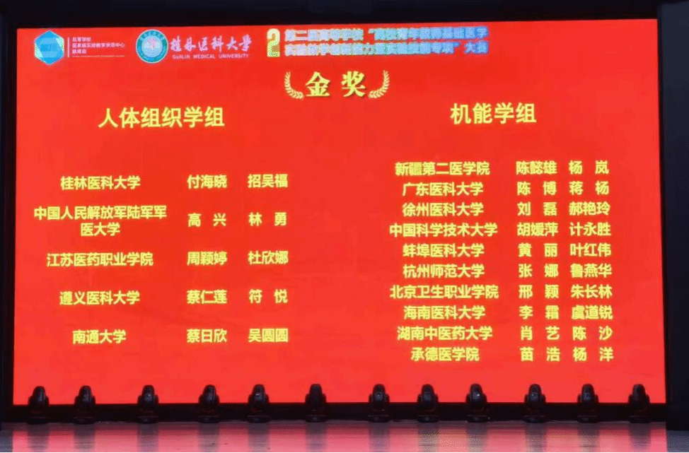 10月27日,第二届高等学校“青年教师基础医学实验教学创新能力暨实验技能专项”总决赛在桂林医科大学落幕。我校基础医学院黄丽、叶红伟老师团队凭借扎实专业功底、创新教学设计与出色现场展示,从全国多所高校选手中脱颖而出,斩获总决赛机能组金奖!