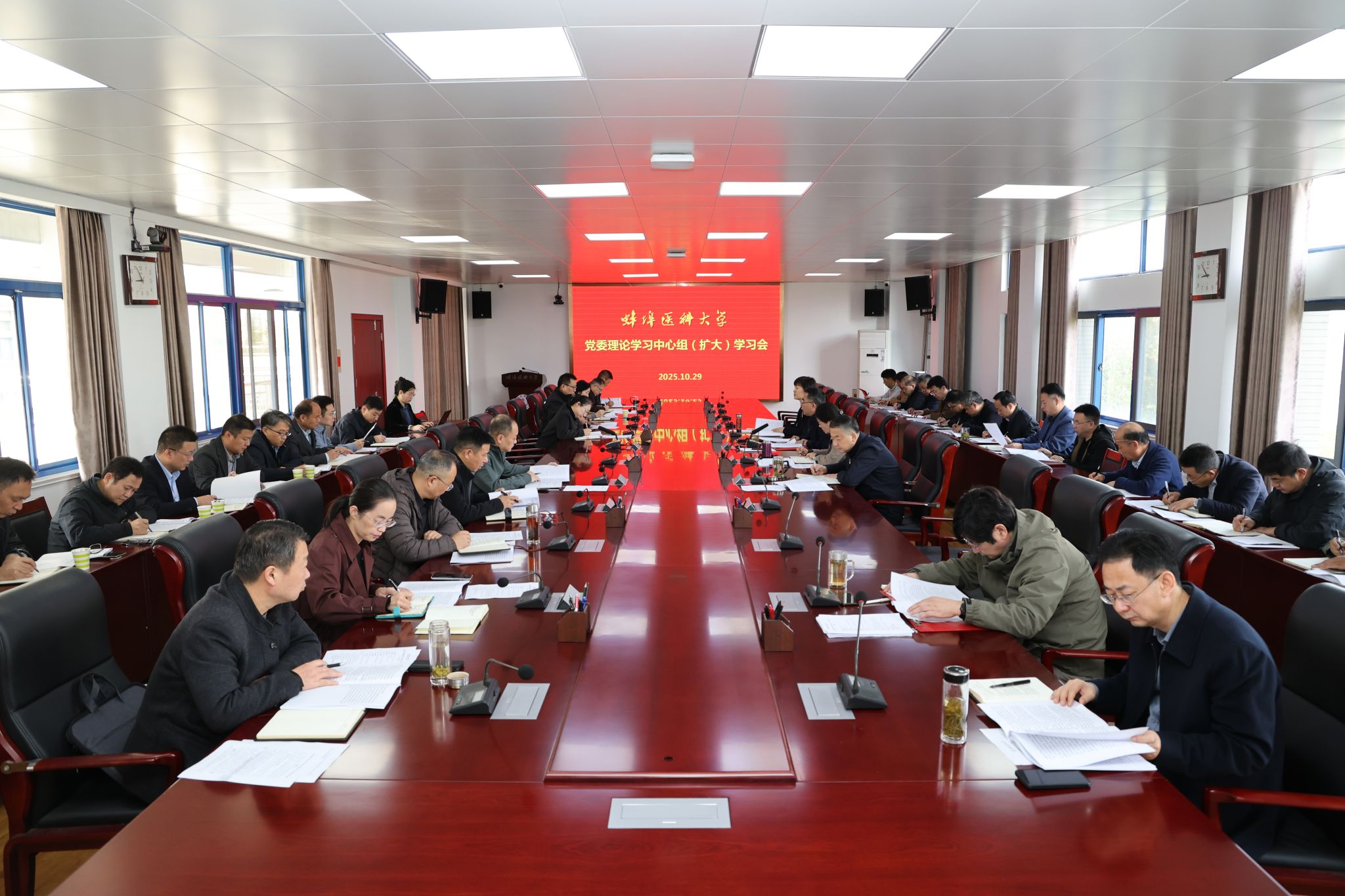 10月29日上午,学校召开党委理论学习中心组(扩大)学习会,专题学习贯彻党的二十届四中全会精神。校党委书记朱立军主持会议,校领导郑兰荣、姚强、高仲姣,校党委理论学习中心组成员、二级党组织及职能部门负责人参加。