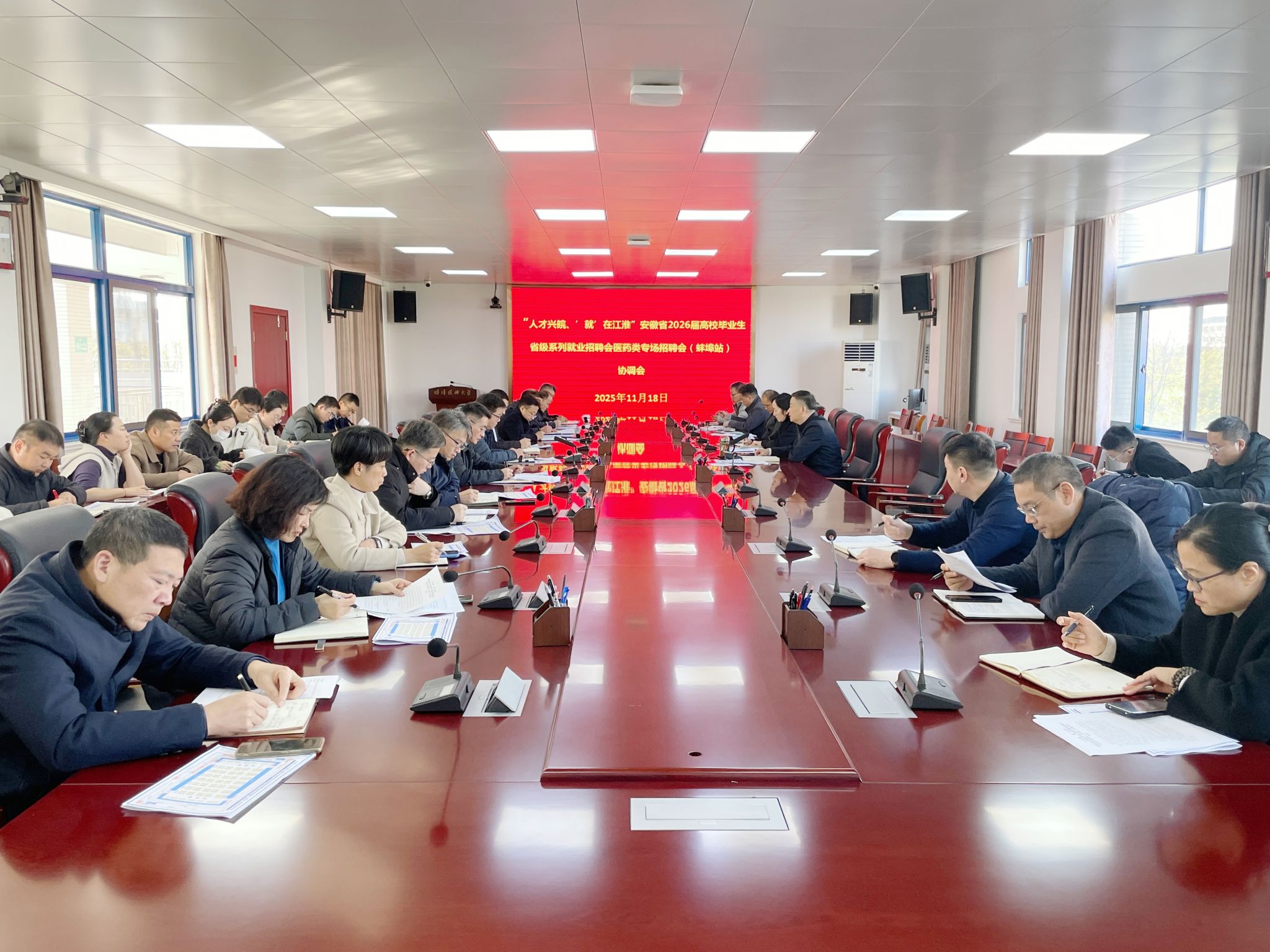 11月18日下午,学校召开2026届毕业生省级系列就业招聘会(蚌埠站)协调会。校党委常委、副校长姚强主持会议,相关职能部门负责人、各学院学生工作负责人及2026届毕业年级辅导员参加会议。