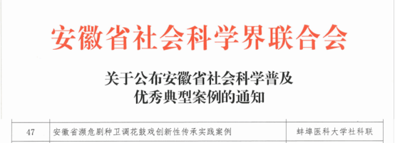 11月17日,安徽省社会科学界联合会公布了安徽省社会科学普及优秀典型案例,我校报送的“安徽省濒危剧种卫调花鼓戏创新性传承实践案例”获评安徽省社会科学普及优秀典型案例。