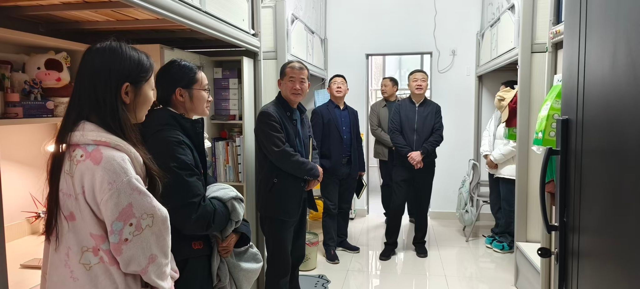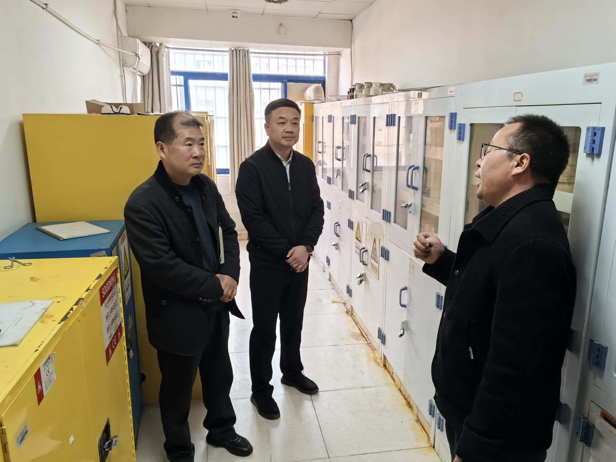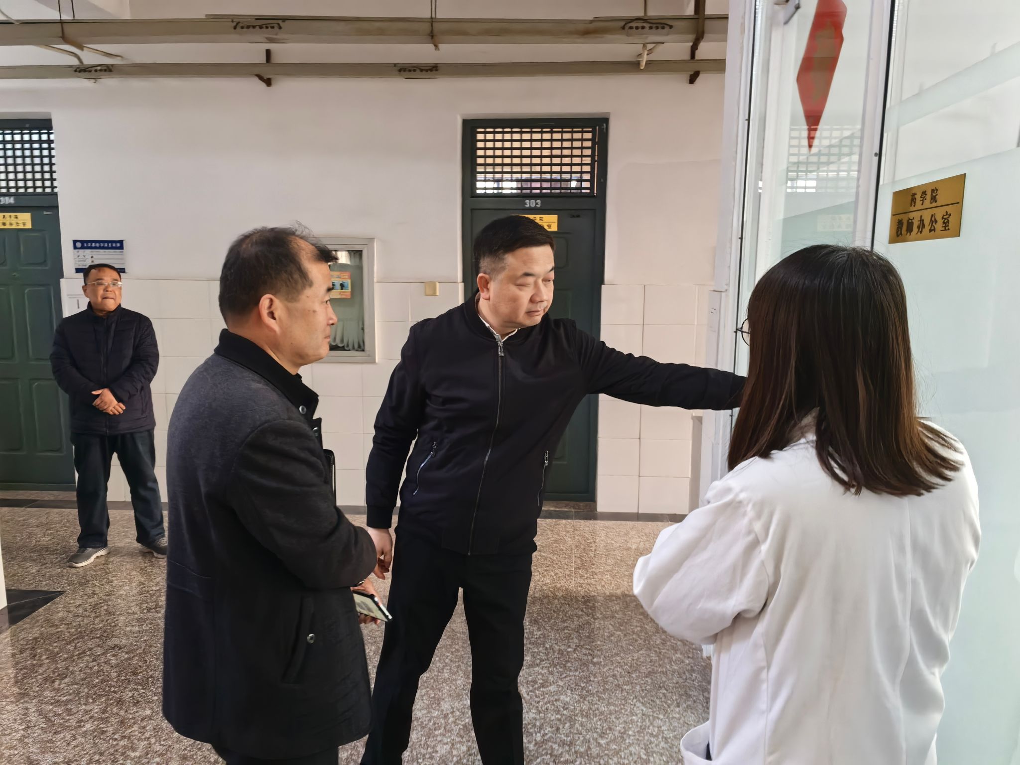 检查组一行深入学生宿舍、科研楼、D座实验楼、校医院等人员密集重点场所,重点查看消防通道与安全出口是否畅通、有无杂物堵塞;灭火器、消防栓等消防设施是否完好有效;有无乱拉电线、私改电路、违规使用大功率电器及使用明火等现象;危化品采购、储存、领用、废弃各环节管理是否规范,是否专人负责、储存场所是否合规等。