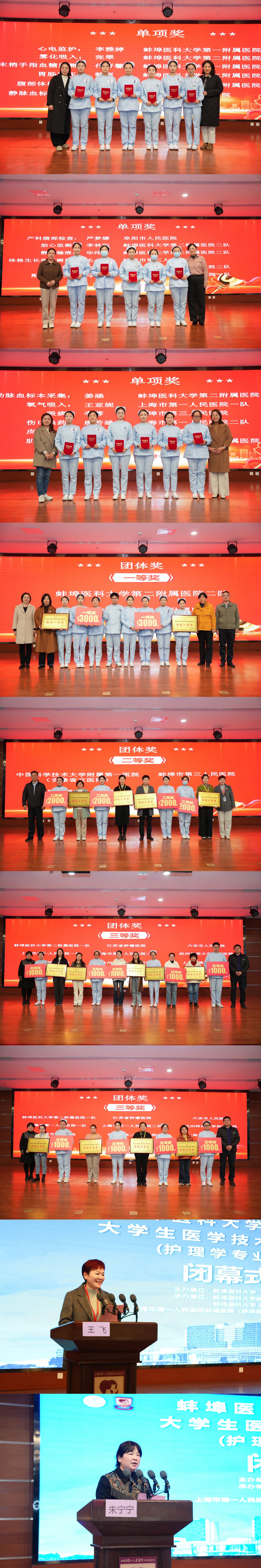 经过一天紧张、激烈的角逐,决出一等奖2名、二等奖4名、三等奖9名,个人单项奖18名。蚌埠医科大学第二附属医院二队、蚌埠医科大学第一附属医院获一等奖;中国科技大学附属第一医院(安徽省立医院)、蚌埠市第三人民医院、合肥市第二人民医院队、阜阳市人民医院获二等奖;上海市第一人民医院、江苏省肿瘤医院等获三等奖;王亚妮等同学分别获单项奖。裁判长王飞对赛事进行了全面点评,朱宁宁宣读了获奖名单。