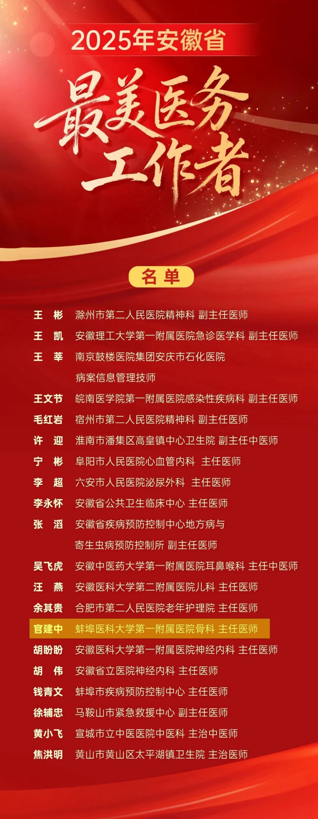 近日,2025年“安徽省最美医务工作者”名单正式公布,第一附属医院骨科主任医师官建中被安徽省卫生健康委员会、中共安徽省委宣传部授予2025年“安徽省最美医务工作者”称号。
