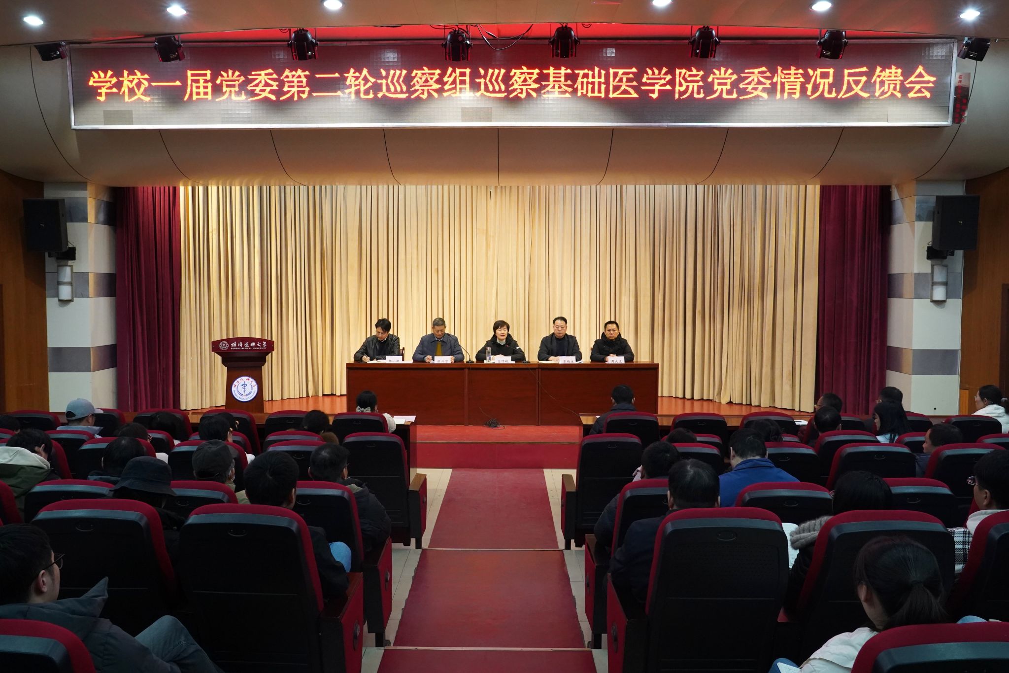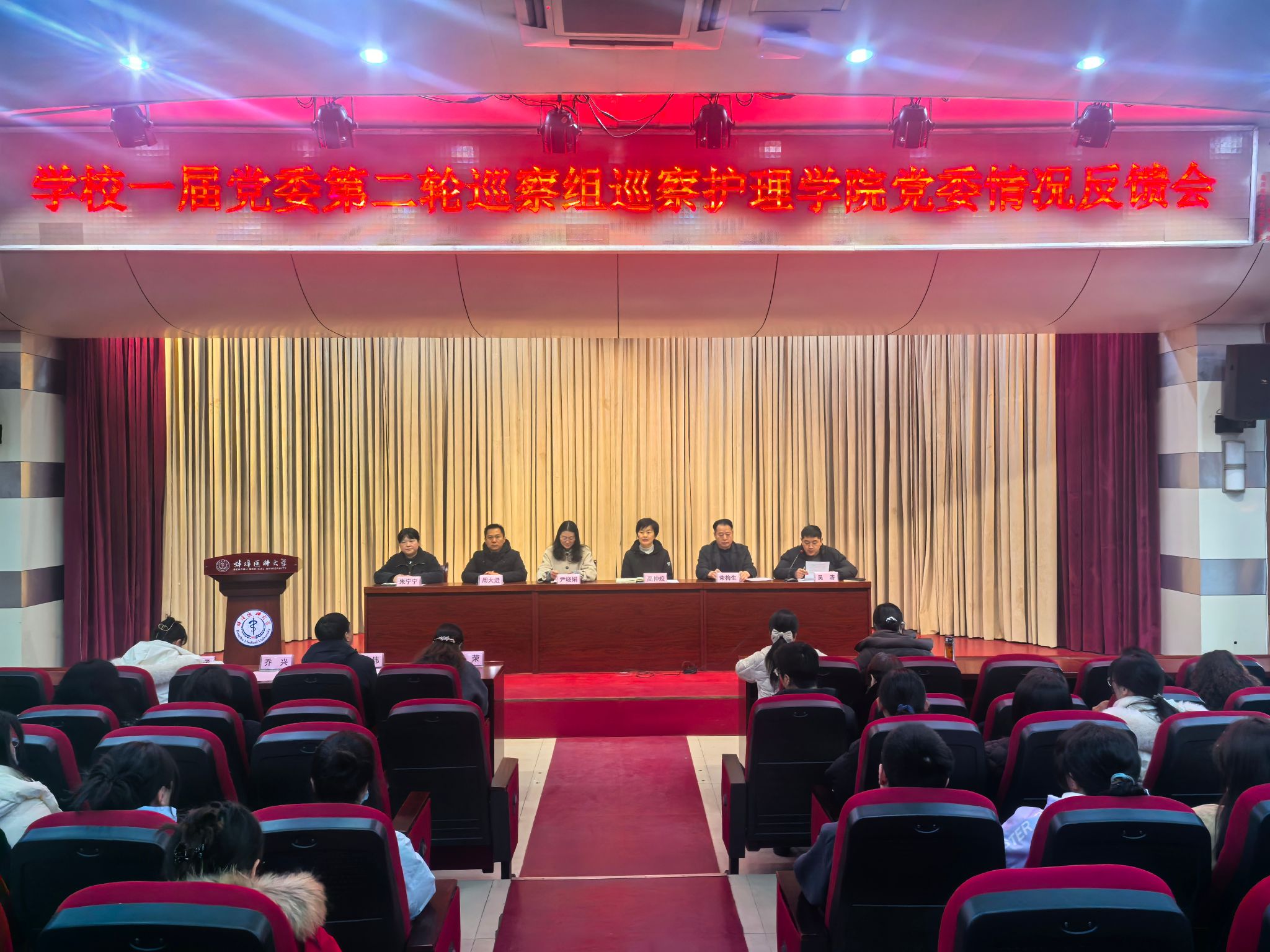 护理学院、基础医学院领导班子,两学院全体教职员工、学生代表,巡察组全体成员及党委巡察办全体人员参加会议。