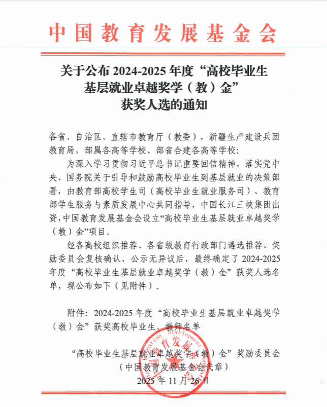 近日,2024-2025年度“高校毕业生基层就业卓越奖学(教)金”获奖名单正式公布,我校2018届医学影像技术专业毕业生赵滨滨凭借在西藏基层医疗战线的七年坚守与突出贡献光荣入选,成为全国获此殊荣的优秀高校毕业生代表之一,这也是继2022年我校药学专业杨智浩之后第二位获此奖项的优秀校友,展现了我校育人初心与学子立足基层、勇担使命的时代风采。