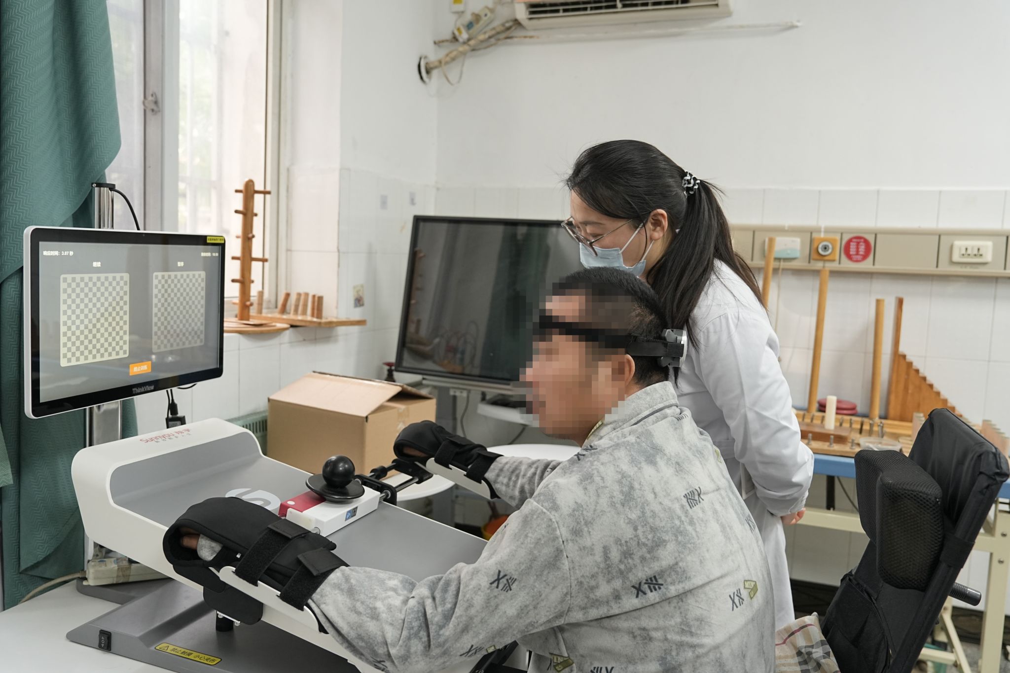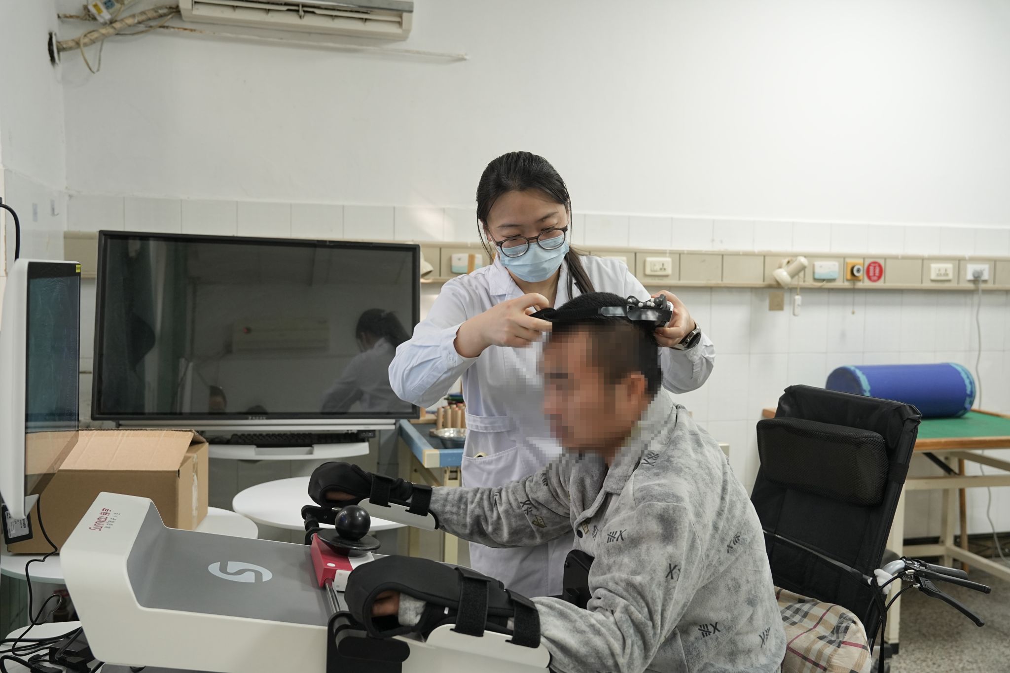 康复医学科治疗团队根据李先生的具体情况,为他安排了脑机接口——上肢等速康复训练。在训练病房,李先生佩戴完脑机接口后,通过面前的图片选择显示终端,借助轻量化8导联脑电设备捕捉运动意图,实现功能障碍手臂的运动。