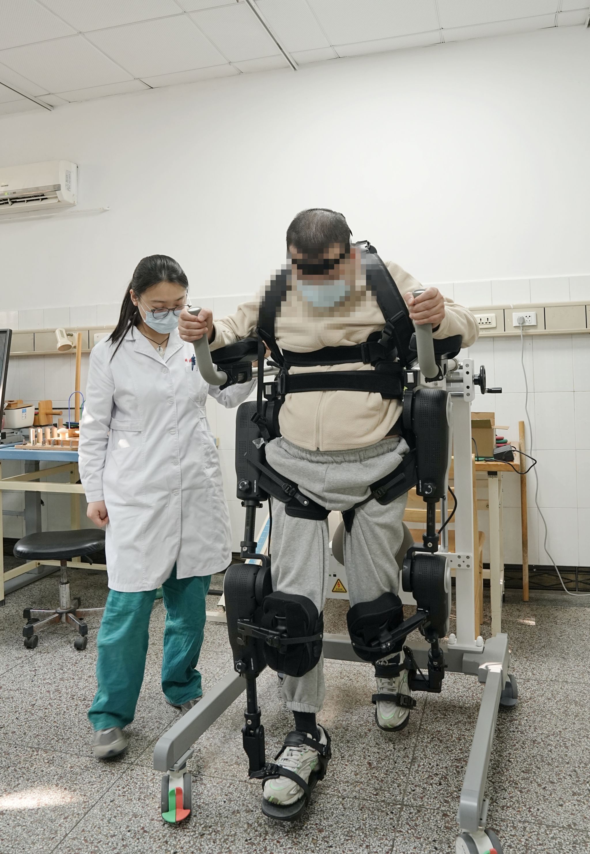 今年42岁的赵先生,8个月前因为一场突发变故,导致胸椎脊髓损伤,双下肢运动功能完全丧失(ASIA分级B级),长期靠轮椅生活。在康复医学科专家团队的帮助下,赵先生运用脑机接口-下肢外骨骼机器人完成了步态重塑训练,借助站立架8个月后第一次实现了站立。