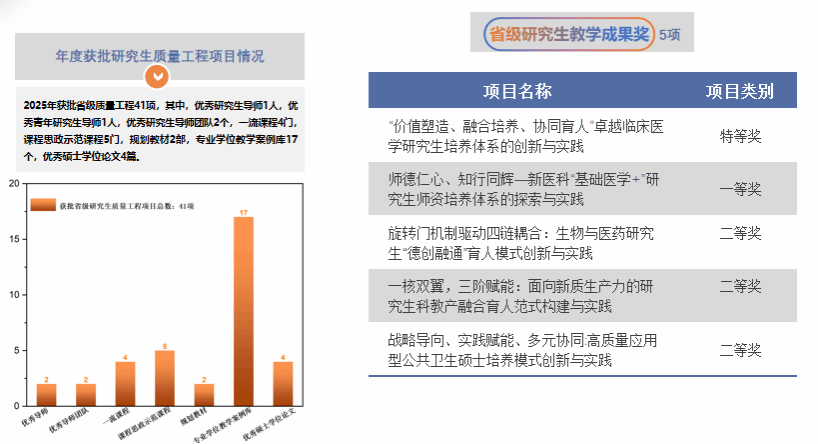 聚力教学成果凝练,瞄准更高奖项。积极培育和凝练教学改革成果,获批省级教学成果奖(含本科生和研究生教育)15项,其中省级特等奖2项,一等奖3项。