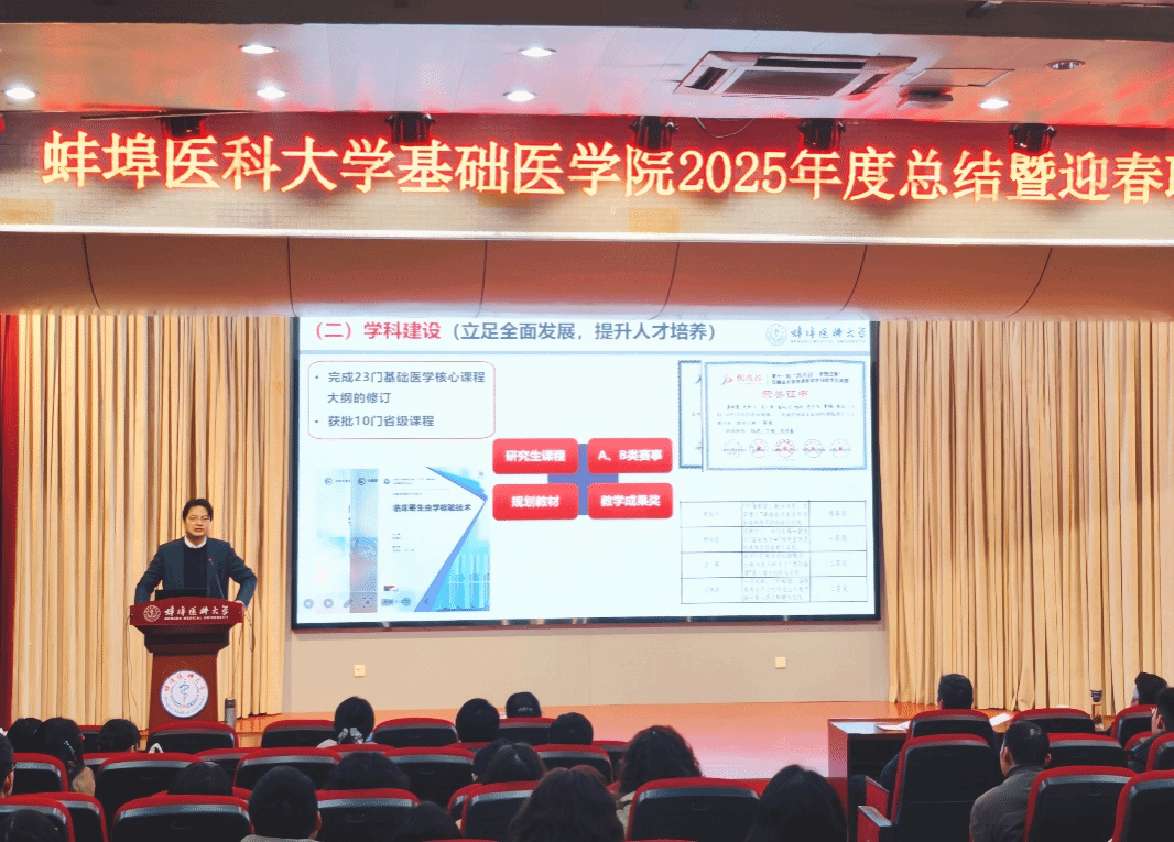 辞旧迎新启新程,凝心聚力向未来。1月23日下午,基础医学院举办2025年度总结暨迎春联欢会,全院师生欢聚一堂,回顾一年耕耘成果,共庆新春美好时刻。校党委副书记、校长郑兰荣出席。