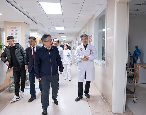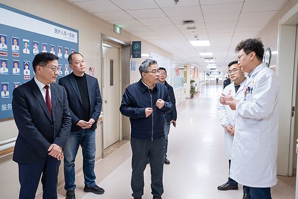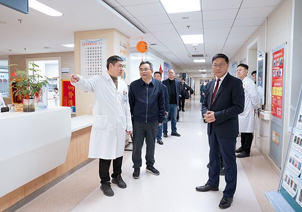 朱立军一行首先来到门诊大厅,深入临床一线,实地走访了急诊内科、影像中心、血液内科、产科、神经外科、骨科四病区、肿瘤外科、心内科、泌尿外科、消化内科、普外科、呼吸内科等重点科室。每到一处,朱立军都与值班医务人员深入交流,详细询问节日期间医疗安排、患者救治、科室运行等情况,对大家在过去一年中为守护人民健康、推动医院发展所付出的辛勤努力表示衷心感谢。