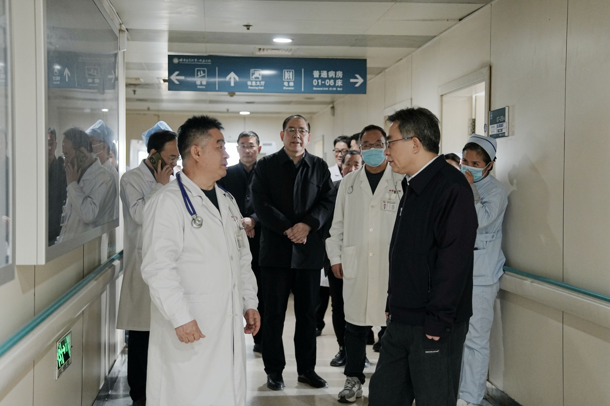 朱立军一行先后深入9号楼、内科楼看望坚守岗位的医护人员。每到一处,他都向医护人员详细了解科室医疗、教学、科研及节日期间值班安排等情况,对大家坚守医疗岗位、守护百姓健康的辛勤付出表示衷心感谢。