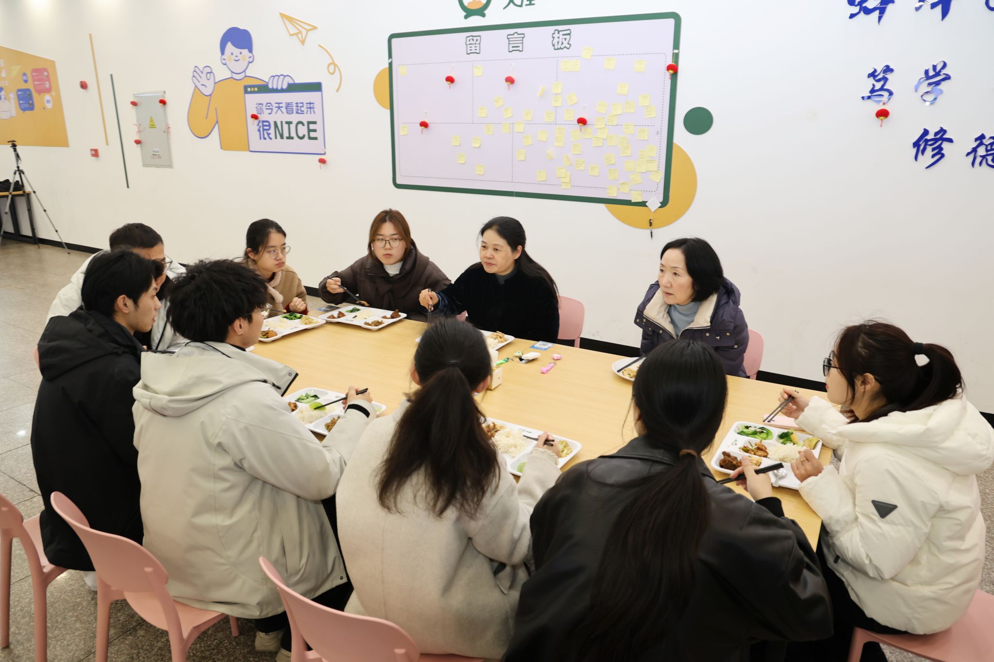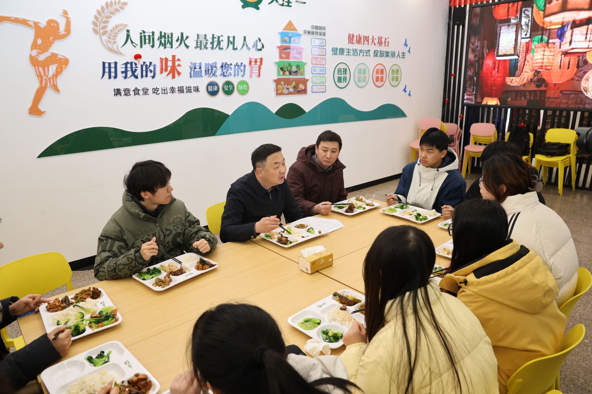 “今天中午有鱼块和排骨,喜欢吃吗?”中午十二点一刻,郑兰荣和姚强端着餐盘坐到学生中间,边吃边聊。食堂的饭菜是否可口?对学校的课程安排有什么建议?毕业后是打算就业还是继续深造?围坐一起,师生们敞开心扉,畅所欲言。同学们汇报寒假收获,聊学习生活,谈大学规划,积极为学校建设发展建言献策;校领导认真倾听、一一回应,对学生积极关心学校发展给予充分肯定,表示学校将全力创造更加优质的生活条件和学习环境。交流中,校领导不仅关心同学们的“盘中餐”“身边事”,更关切大家的“成长路”,听说一位同学是临床医学专业定向生,郑兰荣连连点头说:“国家正在大力推进美丽乡村建设,你的专业大有前途!努力向前,学校是你最坚强的后盾!”她还勉励同学们要厚植家国情怀,树立正确就业观,到基层去、到祖国最需要的地方去。