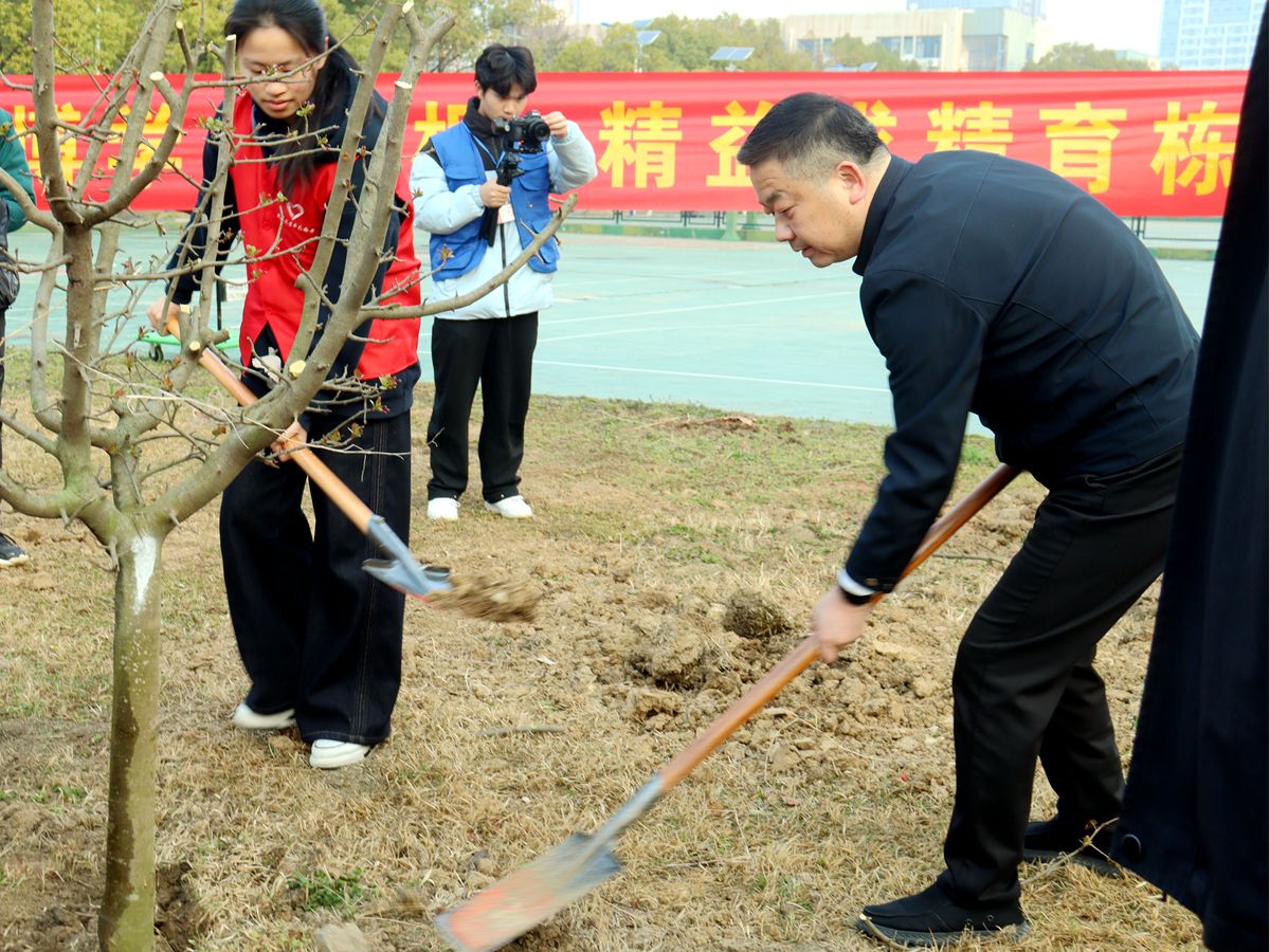 上午7时30分,校领导来到植树现场,与青年志愿者们并肩劳作、躬身示范。师生分工明确、协作有序,挥锹铲土、扶苗固根、培土压实、提水浇灌,每道工序都细致认真、一丝不苟,在春天种下一棵棵绿色的希望。