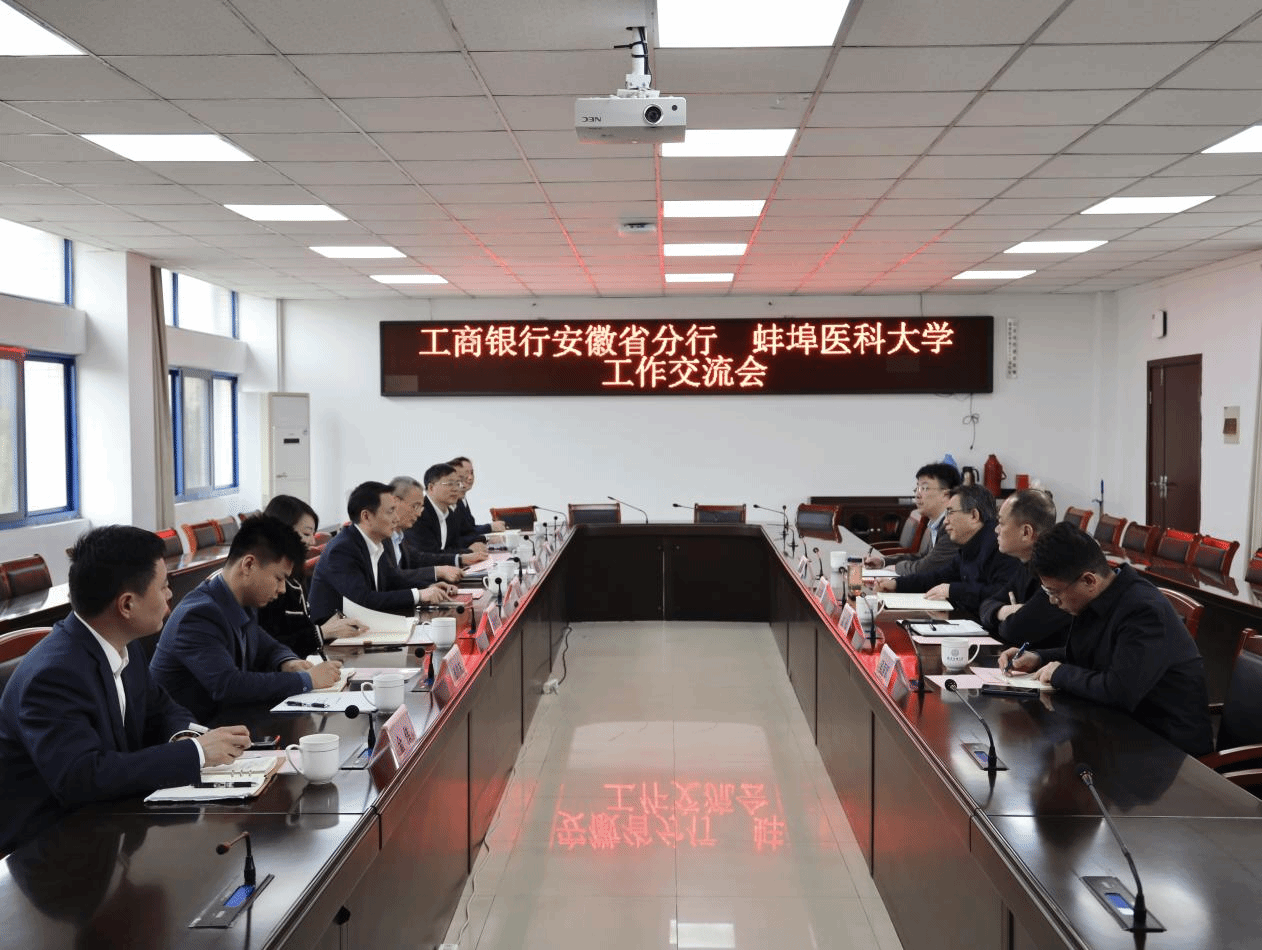 3月25日下午,工商银行安徽省分行党委委员副行长宋磊、省分行高级专家兼养老金融部主要负责人苑卫东、工商银行蚌埠分行党委书记行长许含芝一行来校开展工作交流。校党委书记朱立军,校党委常委、第二附属医院党委书记高恒,以及校财务处、第一附属医院相关负责人参加座谈。