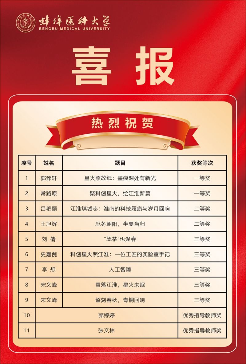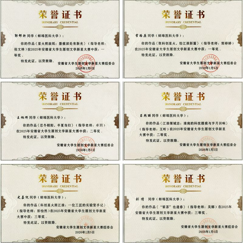 近日,由安徽省教育厅主办、安徽大学承办的2025年安徽省大学生原创文学新星大赛获奖结果公布。我校学子凭借扎实的文学素养与真挚的创作情感在比赛中脱颖而出,斩获一等奖2项、二等奖2项、三等奖5项,学校还荣获优秀指导教师奖2项,充分展现了医学生兼具仁心仁术与人文底蕴的综合素养。
