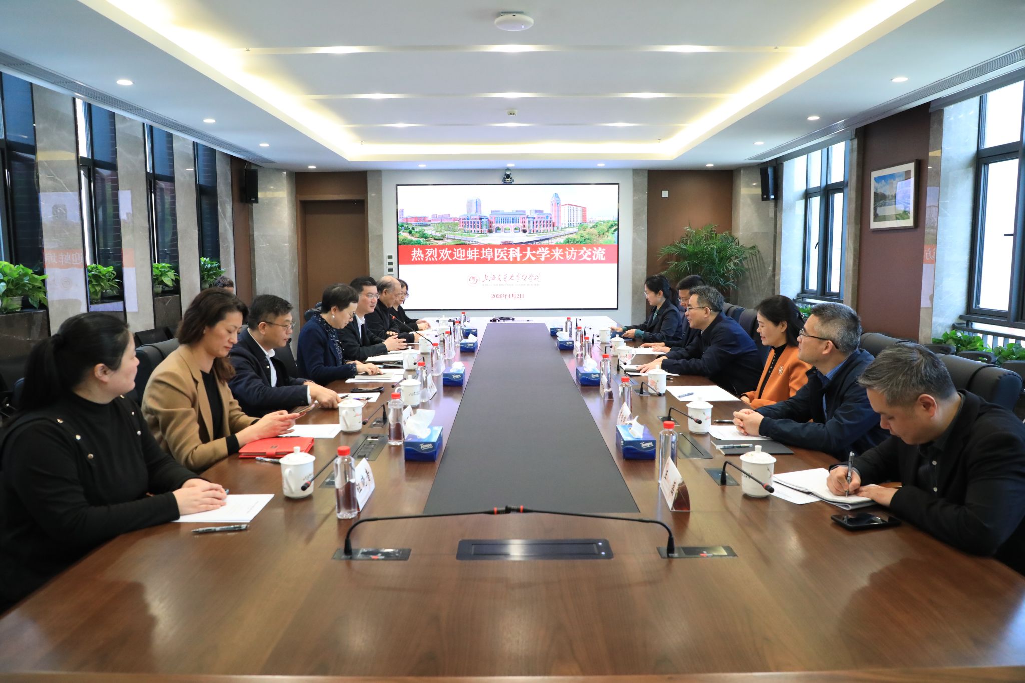 4月2日上午,校党委书记朱立军,校党委副书记、校长郑兰荣率队赴上海交通大学医学院,就深化两校全面战略合作进行座谈交流。上海交通大学医学院党委书记张艳萍,党委副书记、副院长吴正一等参加座谈。