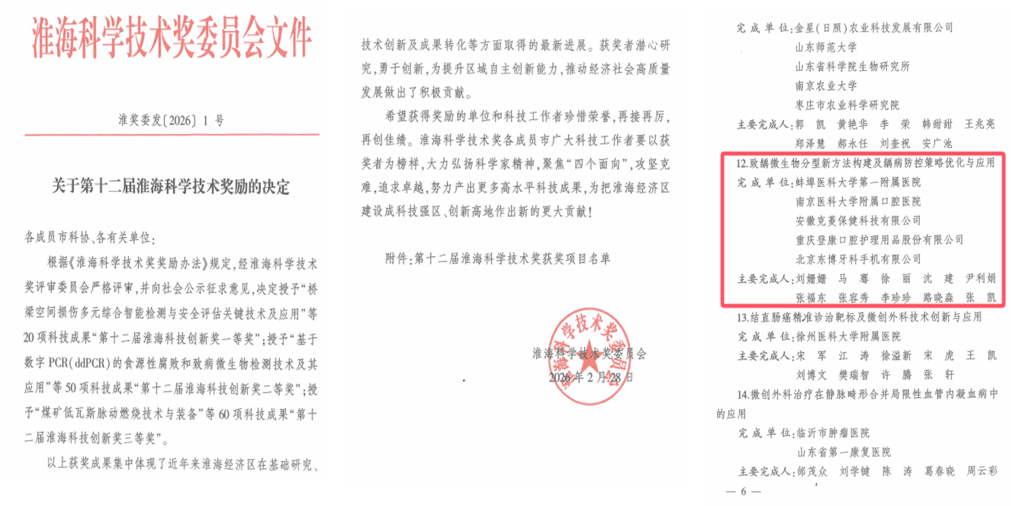 近日,由我校一附院口腔科张凯团队牵头,联合安徽克菱保健科技有限公司等多家单位共同完成的项目《致龋微生物分型新方法构建及龋病防控策略优化与应用》凭借突出的原创性、实用性与转化价值,荣获淮海科技创新奖一等奖。这是我校在口腔医学领域产学研深度融合、服务地方健康产业发展取得的又一重大突破。