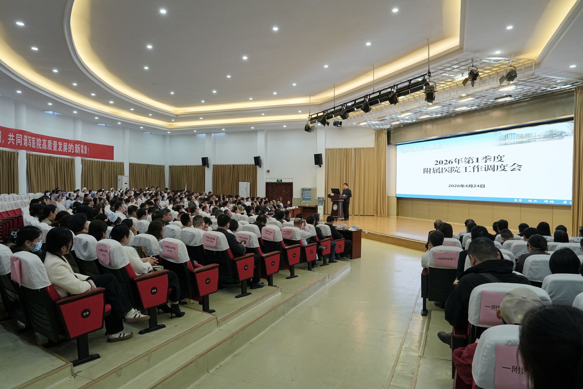 4月24日下午,学校在一附院召开2026年第一季度附属医院工作调度会。校领导朱立军、郑兰荣、姚强,相关职能部门负责人,两所附属医院党政领导班子、各职能部门负责人、各临床医技科室主任、护士长参加会议。