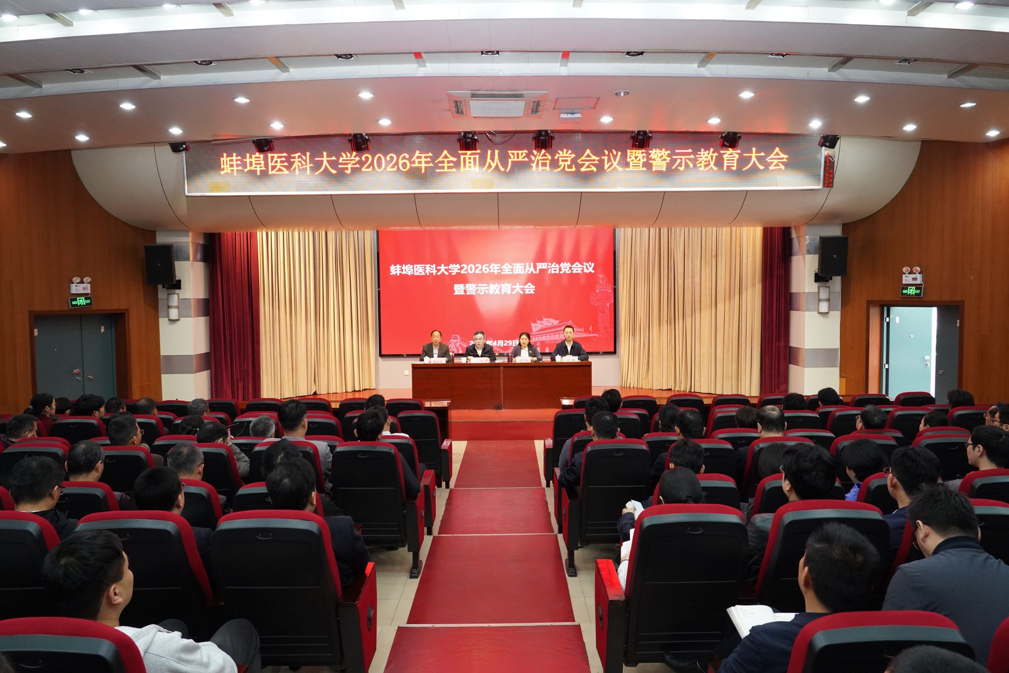 4月29日,蚌埠医科大学2026年全面从严治党会议暨警示教育大会召开。校领导朱立军、郑兰荣、陈昌杰、刘浩,校党委委员、纪委委员,各二级学院纪委书记,全体处级干部,校本部纪委办、组织、人事、巡察办、科研、审计、财务、国资、后勤、信息化管理处等职能部门科级干部参加会议。