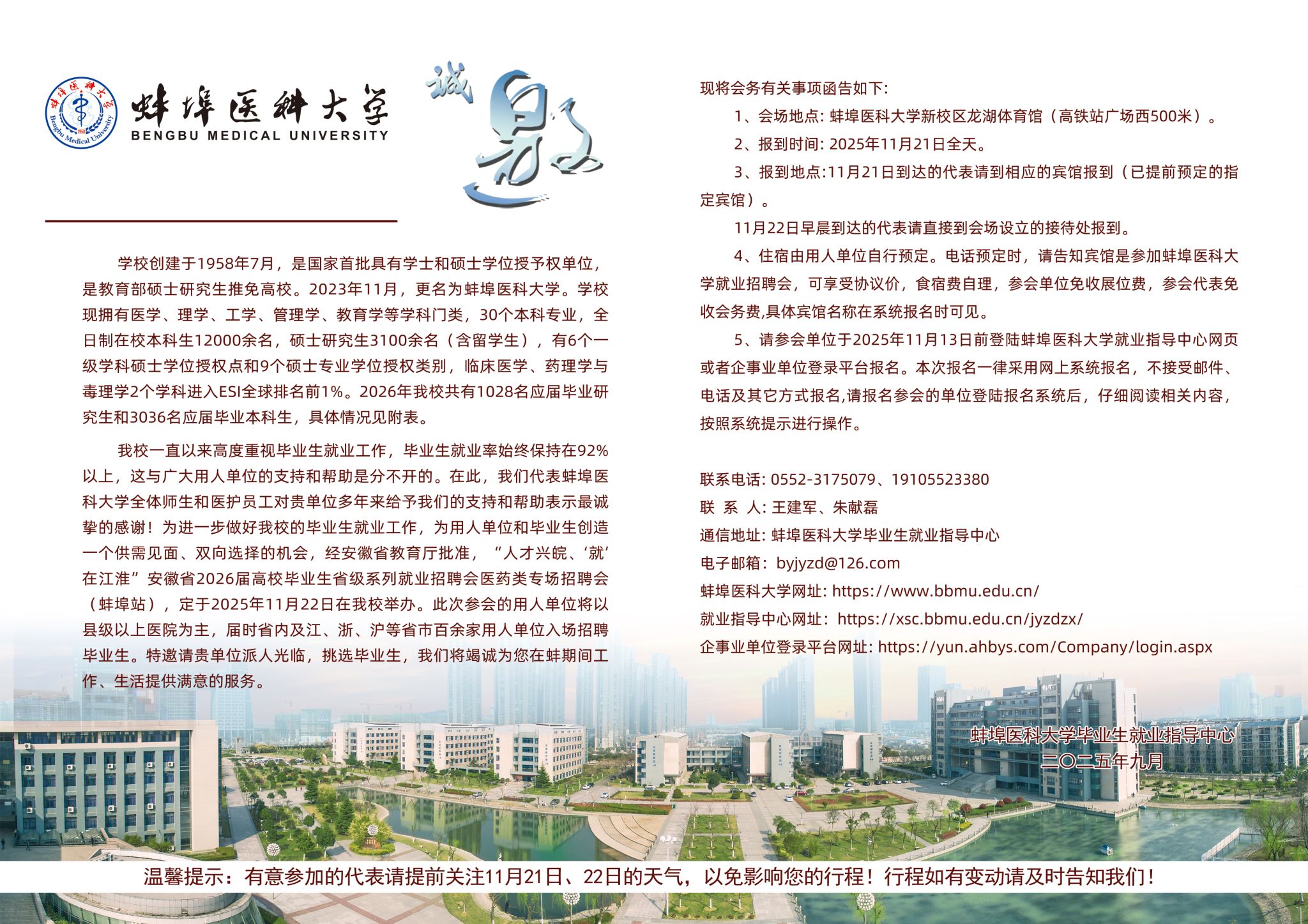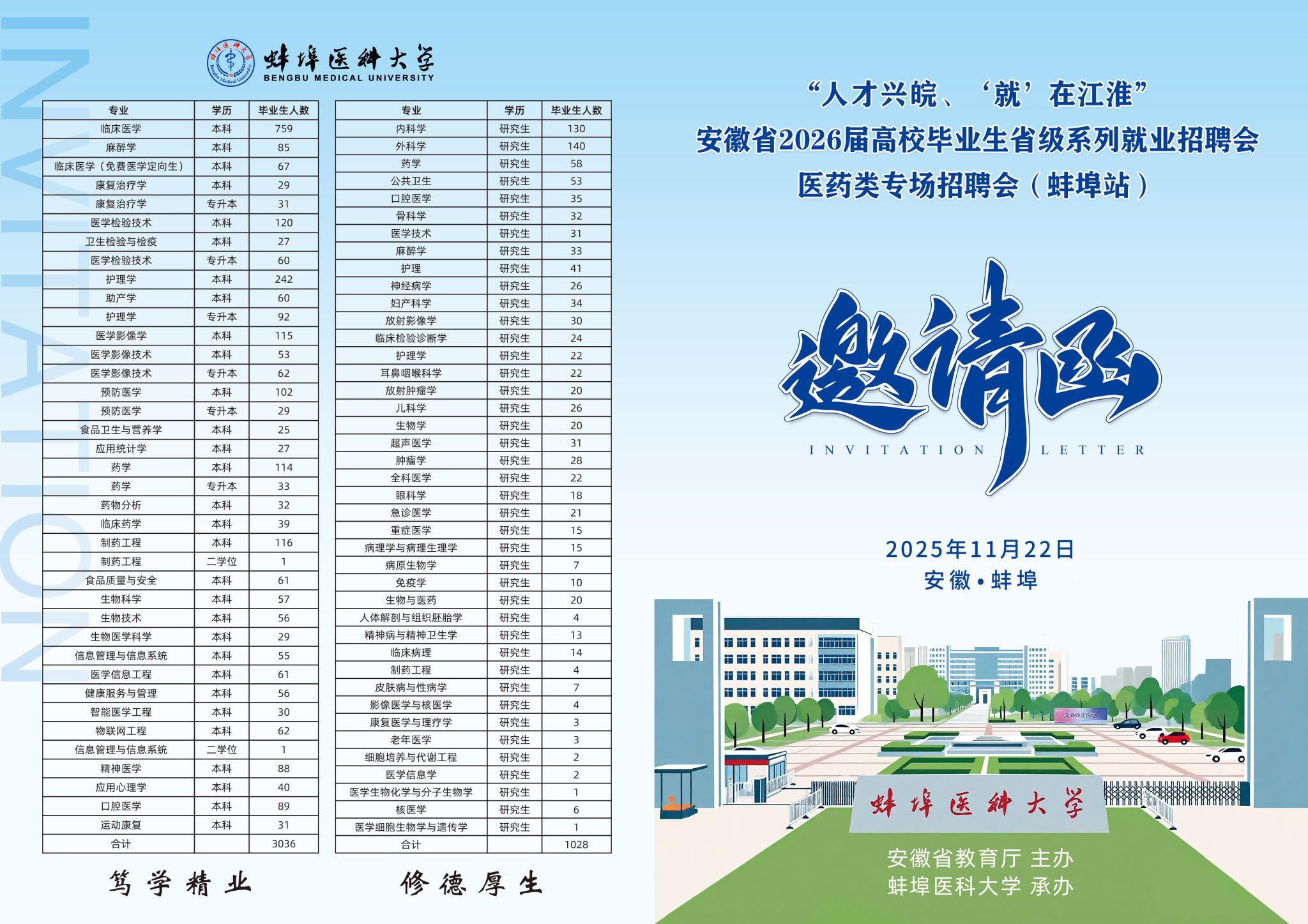 高校毕业生是党和国家宝贵的人才资源,促进高校毕业生就业事关民生福祉和国家未来。党中央高度重视高校毕业生就业工作,为深入贯彻党的二十大和二十届二中、三中全会精神,坚持就业优先战略,强化就业优先政策,破解结构性就业矛盾,为毕业生就业提供更精准、更高效的就业指导和就业服务,形成衔接校内校外、助力成长成才的服务支撑。根据安徽省教育厅的统一布置,我校将承办“人才兴皖、‘就’在江淮”安徽省2026届高校毕业生省级系列就业招聘会医药类专场招聘会(蚌埠站),为做好本次活动,现将有关事项函告如下,欢迎各用人单位参加。