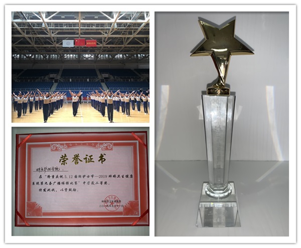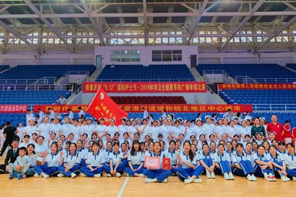 5月11日下午,由蚌埠市卫生健康委员会主办的“隆重庆祝5.12国际护士节—2019蚌埠卫生健康系统第九套广播体操比赛”在龙湖体院馆举行,来自蚌埠市卫生机关单位和医疗机构的16支代表队参加了比赛,护理学院代表学校参赛。经过激烈角逐,护理学院代表队凭借精彩表现取得优异成绩,荣获二等奖。
