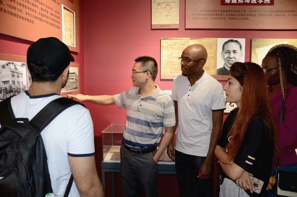 此次参访地主要是我校的校史馆及人体科学馆。在校史馆内,团委马文静老师声情并茂地向来访的韩国学生及我校留学生们详尽地介绍了学校的历史沿革、教学科研成果及国际交流等内容。参访同学在认真聆听讲解的过程中,了解了我校的历史,并对首任院长谢炘“宁可让学生在我身上划错千刀,也不能让学生在病人身上划错一刀”的话语及李涤生下乡体检诊疗箱实物等钦佩不已,深切感受到在学校发展历史中蚌医人一脉相承的奋斗精神,砥砺前行的豪迈情怀以及无私奉献的精神境界。