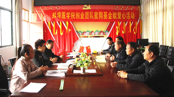 捐赠仪式上,团队负责人谢枫代表公司发表了“学会感恩,留下给予”的讲话,表达了作为大学生创业团队对回报社会、热心公益的想法和决心,并表示将长期对当地教育尽自身绵薄之力。当地扶贫办王书记,学校马校长及学校教师代表对“蜜狗公司”的善举表示了诚挚的感谢,并高度赞扬了蚌埠医学院积极引导和大力支持大学生创业的行为。