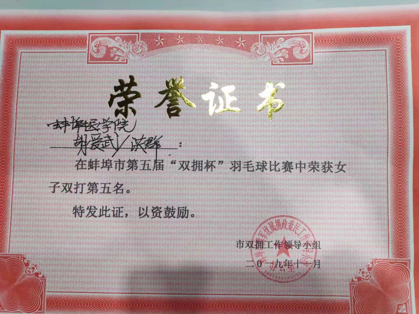 争创双拥模范城,共建和谐新蚌埠。11月12日-14日,由市双拥办联合蚌埠军分区政治工作处、市直机关工委、市体育局和市总工会共同举办蚌埠市第五届“双拥杯”羽毛球赛在蚌埠市职教园体育馆开赛,我校职工羽毛球队与来自驻蚌部队、市直各部门、企事业单位和各县区的54支代表队近600人共同参加了比赛。