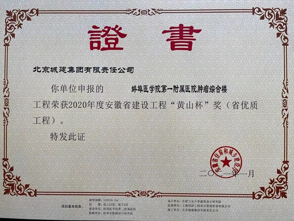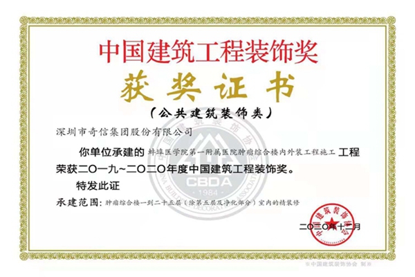 在肿瘤综合楼交付使用将近两年之际,从中国建筑装饰协会、安徽省住房和城乡建设厅传来喜讯:该项目获得国家级、省级大奖——“中国建筑工程装饰奖”和安徽省“黄山杯”。