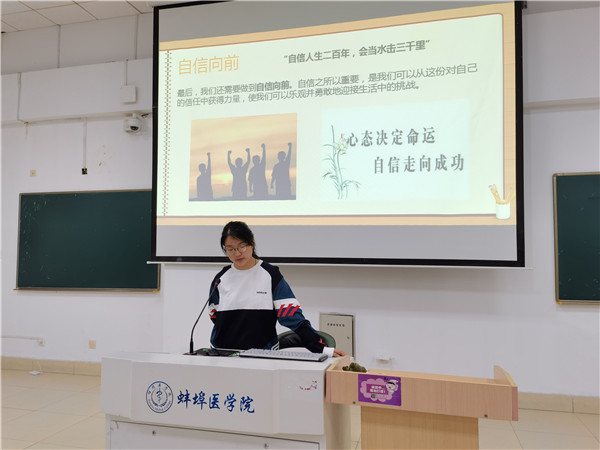 文体委员张慧以“从心出发 向新而行”为主题,分析了当前大学生普遍面临考试焦虑问题,特别是医学生因课程门类繁多、学业任务重,加之医学生将来要从事的职业与人类健康息息相关,医学院校对学生的学业要求也要高于其他专业的学生,每学期课程结束之后更要经历“考试月”,其中也反映了许多焦虑、不自信等典型不良情绪和心理问题,具体讲述了考试月乃至人生中保持自信的重要性,号召同学们在党史学习中不断坚定“四个自信”,深刻理解“四个自信”的精神内核,从“大我”到“小我”,转化为自己独特的精神力量,在自我认知和自我提升的过程中增强自信。