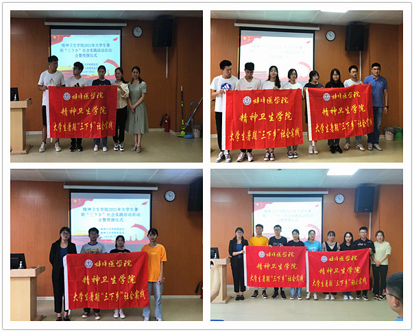 为深入学习宣传贯彻习近平新时代中国特色社会主义思想,引导广大青年在社会实践中受教育、长才干、做贡献,积极践行习近平总书记在庆祝建党一百周年大会上的重要讲话精神,按照《关于开展2021年大学生暑期“三下乡”社会实践活动的通知》(团委〔2021〕14号)的精神和要求,精神卫生学院于7月5日下午在E座515室举行2021年大学生暑期“三下乡”社会实践活动项目启动会暨授旗仪式。会议由学院团总支书记潘梦蝶主持,学生党支部书记李礼、各年级辅导员和2021年“三下乡”立项项目的骨干成员参加大会。学院院长张静到会并给各项目代表授旗。
