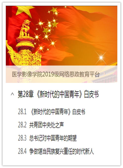 4月21日,国务院新闻办公室发布的《新时代的中国青年》白皮书提到,青年是整个社会力量中最积极、最有生气的力量,国家的希望在青年,民族的未来在青年。中国青年始终是实现中华民族伟大复兴的先锋力量。围绕《新时代的中国青年》白皮书,依托学习通网络思政教育平台,医学影像学院2019年级开展“大学生励志教育——弘扬五一、五四精神,青春献礼二十大”主题学习教育,全面深刻领会白皮书精神内涵,凝聚青春之力,奏响青年之音。