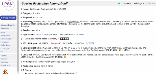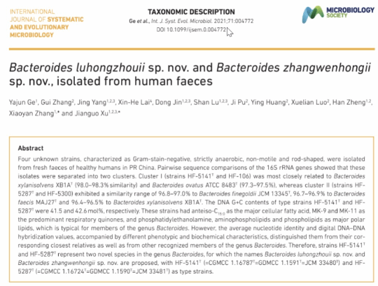 2021年4月,中国疾病预防控制中心传染病防治所徐建国院士团队在ICSP官方杂志《国际系统与进化微生物学杂志(International Journal of Systematic and Evolutionary Microbiology)》上发表题为” Bacteroides luhongzhouii sp. nov. and Bacteroides zhangwenhongii sp. nov., isolated from human faeces”的研究论文,介绍了从中国吉林省一位46岁健康男性面部分离出的四株新的革兰阴性厌氧非运动性杆菌,分别命名为HF-5141T,HF-106,HF-5287T and HF-5300。对其进行16S rRNA基因序列系统发育分析表明,HF-5141T and HF-5287T乃是两株属于拟杆菌属的新菌种。