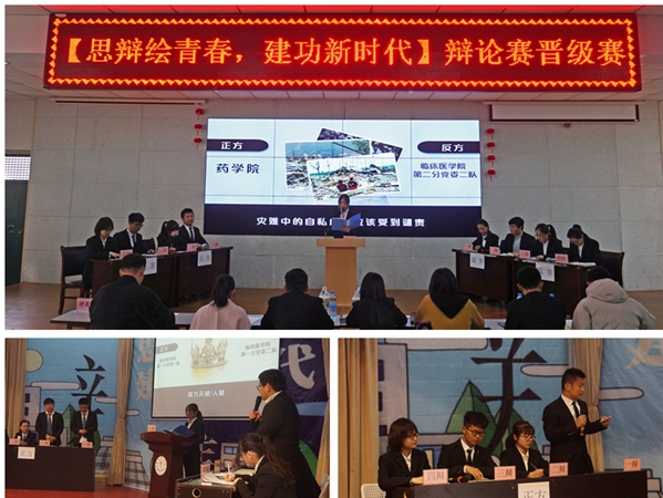 本次校园辩论赛由初赛、晋级赛、半决赛、决赛四个部分组成,汇集各系部选拔推送的30余支参赛队,采用淘汰赛赛制,历时近一个月。经过前两个阶段的激烈交锋,临床医学院(原第一分党委)一队、生命科学学院、临床医学院(原第一分党委)二队、药学院的四支代表队冲出重围,晋级半决赛。4月11日下午,半决赛、决赛如期而至。我校国家级普通话水平测试员何文、马克思主义学院张翮、团委凌浩三位教师与来自驻蚌兄弟高校的校级辩论队负责同学,共同担任现场评委。