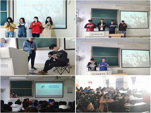 活动在班长的主持下顺利进行。同学们以“自由”为主题,以宿舍为单位,通过演讲、诗歌朗诵、弹唱、PPT展示等多种方式表达出了自己心目中的自由。同学们就纪律与自由、恋爱与自由、网络舆论自由等发表了自己的看法与见解,也有的同学表达了脱离父母看管,享受短暂自我放纵式自由之后所付出的代价。会后,年级辅导员进行总结时强调:同学们应正确认识自由与约束的辩证关系,心中牢记法律法规、校规校纪,有所为有所不为,真正成为为社会主义事业奋斗终身的有用人才;同学们应学会自我约束,为自己心目中的理想,为实现人生的真正自由而不懈奋斗!