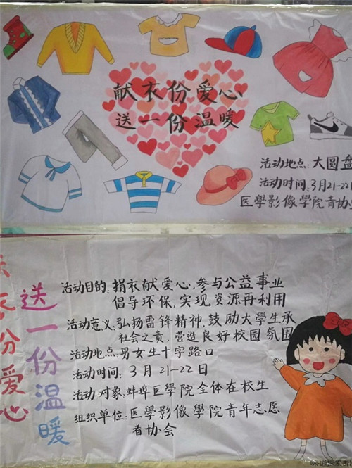 为了进一步传承和发扬雷锋精神,医学影像学院团总支于3月下旬举办了以“献‘衣’份爱心,送一份温暖”为主题的爱心志愿服务活动,活动内容为衣物募捐。