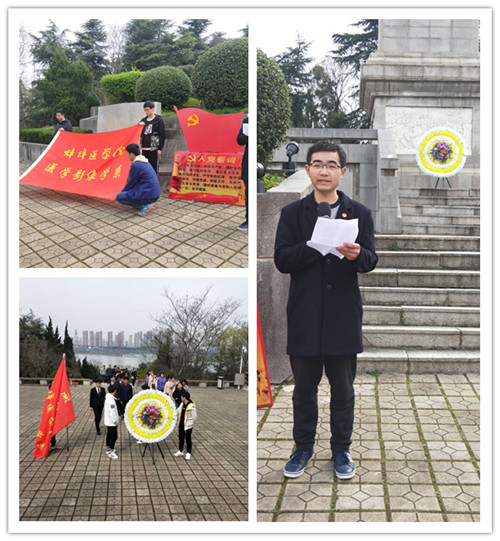 上午九点半活动正式开始,同学们在主持人的带领下面向烈士墓碑,脱帽致敬,庄严肃立。此时,国歌响起,全体师生齐唱国歌。学生代表向烈士敬献花圈并集体默哀,党员代表丁作旭同学带领学生党员们,重温了入党誓词。学生代表杜宏洋同学在墓碑下发表了慷慨激昂、鼓舞人心的演讲。最后,同学们怀着无比尊崇的心情围绕着烈士墓碑瞻仰一圈。