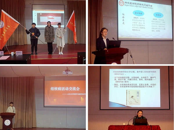 活动伊始,周静对市疾控领导和专家一直以来对我校“爱心结防”活动的支持和指导表示了感谢,以“世界防治结核病日”专题活动为切入点,肯定了我校“爱心结防”志愿服务项目近年取得的成绩,并对未来结核病防控志愿服务活动提出期望。紧接着,公共卫生学院青协及校青协代表分别就院校两级志愿者组织对“爱心结防”工作进行了经验交流;随后,钱青文主任为我校两支接受安徽省“百千万志愿者结核病防治知识传播活动”专项资助的团队进行了授旗。会议最后,市疾控中心李玉环老师以《结核病的前世今生》为题,深入浅出地介绍了结核病定义、传播途径、表现症状、如何治疗等结核病防治的专业知识,为今年新加入的志愿者们进行了专业培训。