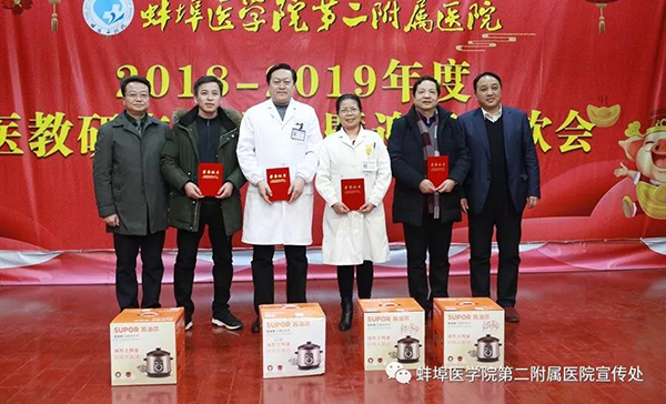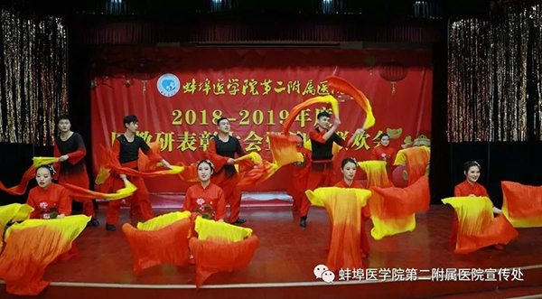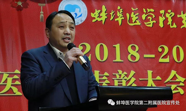 院长崔虎发表热情洋溢的新年贺辞。他指出,2018年全体职工充分发扬敢闯敢试、敢为人先的优良作风,增强善学善思、善做善成的能力本领,荣获国家卫生健康委全国“改善医疗服务行动计划”优秀典型等荣誉;国家药物临床试验机构正式启动研发;省级皖北医养结合示范基地获批筹建;省级重点专科再添新军。同时,医院在全国文明城市创建、教育部本科教学审核性评估、三甲医院复审、安徽省医疗安全质量检查等项重要任务中屡获卫生主管部门表彰。他要求广大医护员工在新的一年,充分发挥党建工作的引领作用,凝心聚力,全面贯彻校党代会的决策部署;整合升级,彰显特色,打造一所“不一样的”二附院,砥砺前行,朝着现代化大健康人文医院的奋斗目标扎实迈进,以优异的成绩向新中国成立70周年献礼!
