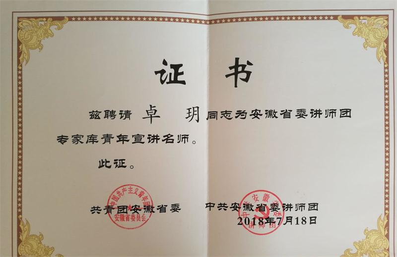 近日,共青团安徽省委、中共安徽省委讲师团联合下发文件公布了中共安徽省委讲师团专家库“青年宣讲名师”最终评选结果,我院教师卓玥成功入选。