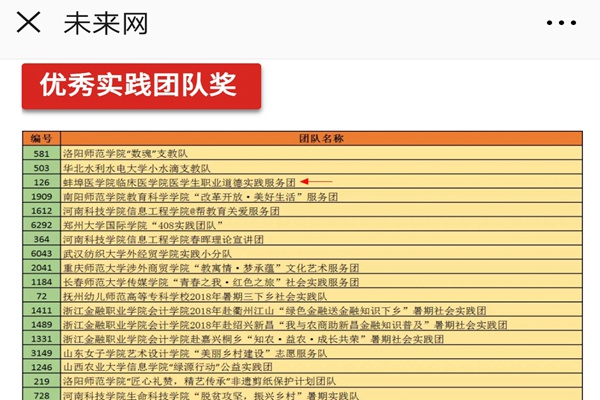 近日,由共青团中央网络影视中心、未来网共同举办的“青春大学习、奋斗新时代”2018第三届全国大中专学生“三下乡”暑期社会实践公益传播力展示活动落下帷幕,在本次公益传播力展示活动中,有来自全国千余所高校近万个团队报名参与,经过大众评选、技术审查、组委会综合评定,我校校级重点实践团队——医学生道德实践服务团(指导教师:黄中岩、凌浩)荣获优秀实践团队奖,黄中岩荣获优秀指导教师奖。