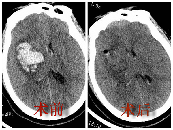 12月28日,家住凤阳县60岁的叶女士突发意识不清,经当地医院对症予止血、脱水、降颅压等保守治疗治疗,但病情愈发加重,紧急转送二附院神经外科。经颅脑CT明确诊断为高血压脑出血,出血量40ml。神经外科副主任王大巍博士立即组织病案讨论、制定治疗方案。专家组根据出血形状,出血量,患者的意识状态和患者的身体条件,认为患者符合行微创神经内镜下脑内血肿清除手术。随即,王大巍博士在其团队密切配合下,借助神经内镜的照明系统和显示系统,应用常规显微神经外科手术器械,通过直径3cm小骨窗切口彻底完成脑内血肿清除术,次日病人复查CT脑内干净无血肿,意识清醒。8小时后复查CT,显示内血肿清除干净,无明显残留及再次出血。